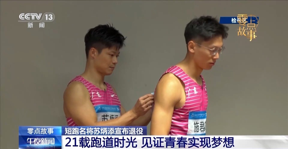 今年的全运会男子4×100米接力决赛,是苏炳添在职业赛场上的最后一舞。当晚的广东奥体中心体育场几乎座无虚席,很多田径迷都在等待着苏炳添再次站上跑道。检录时,苏炳添细心帮年轻的队友别着号码簿,决赛场每个细节都要做好准备。